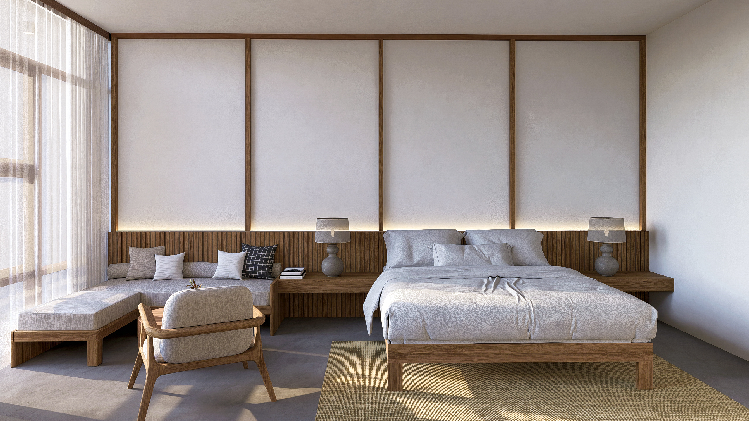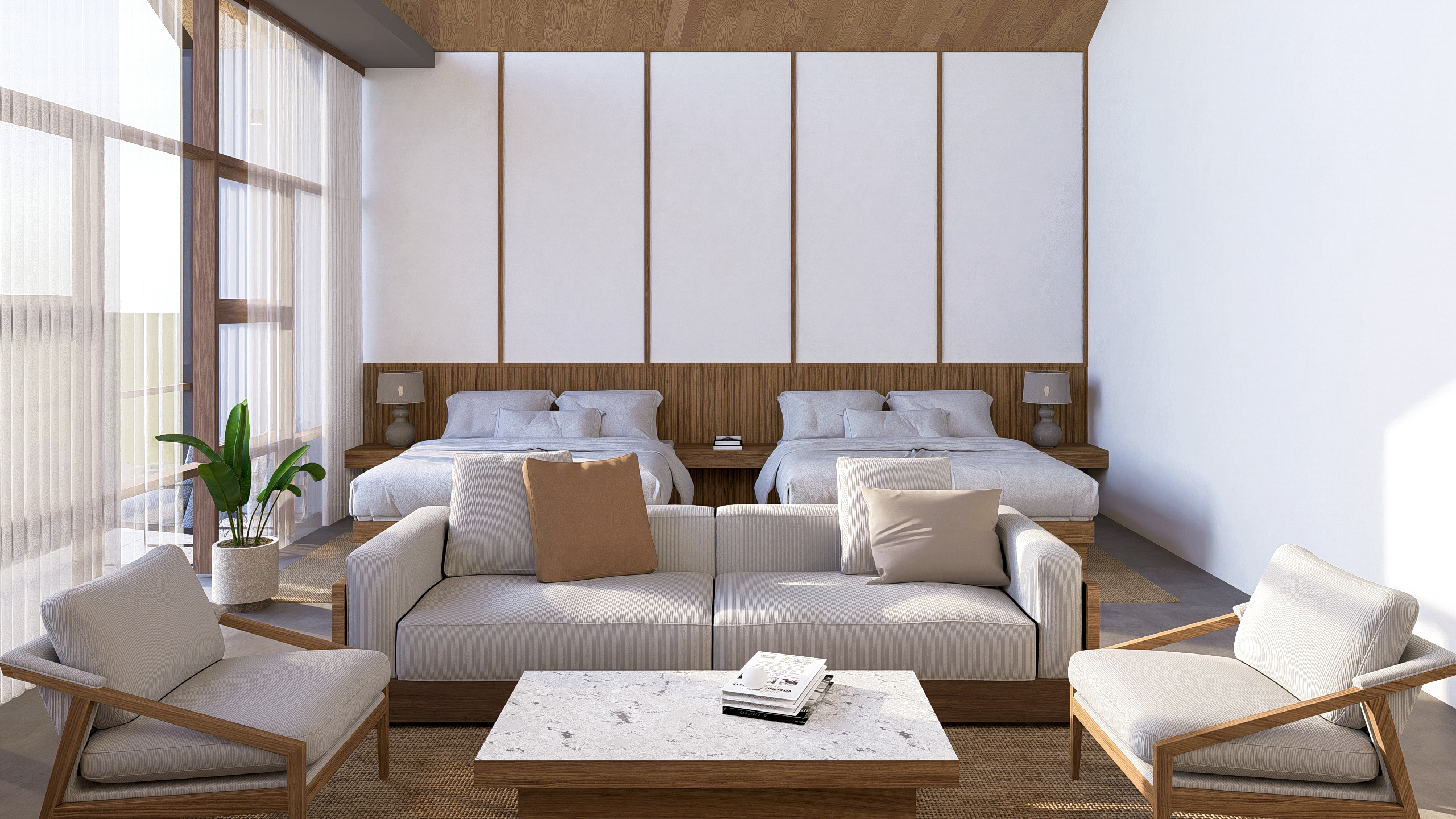 The finishes are soft and earthy, chosen to create a calm and natural atmosphere that blends with the mist of the environment. The overall concept focuses on simple comfort and clear views, giving future guests a practical and welcoming hillside retreat and a perfect getaway from the outside noise.⁣